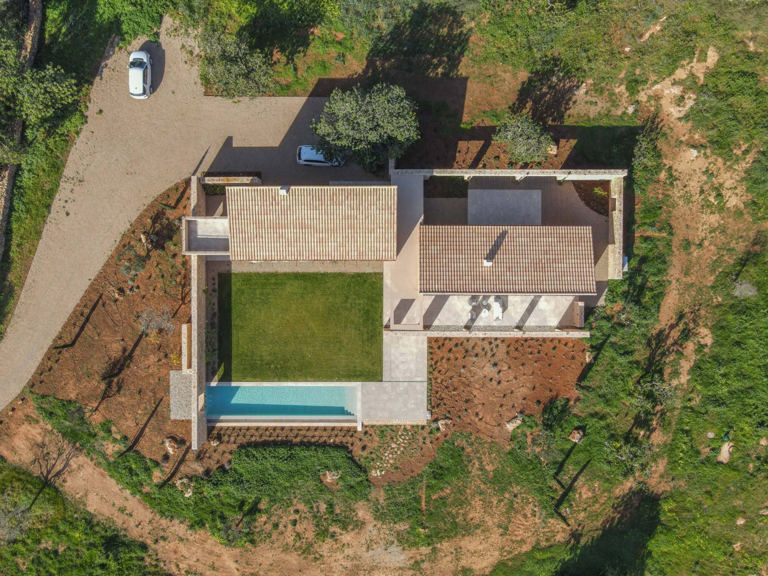 El exterior ha sido concebido para disfrutar del estilo de vida mediterráneo durante todo el año. Amplias terrazas, pérgolas y una espectacular piscina de 45 m² crean un entorno ideal para el descanso, el ocio y las reuniones al aire libre, todo ello en absoluta armonía con el paisaje.