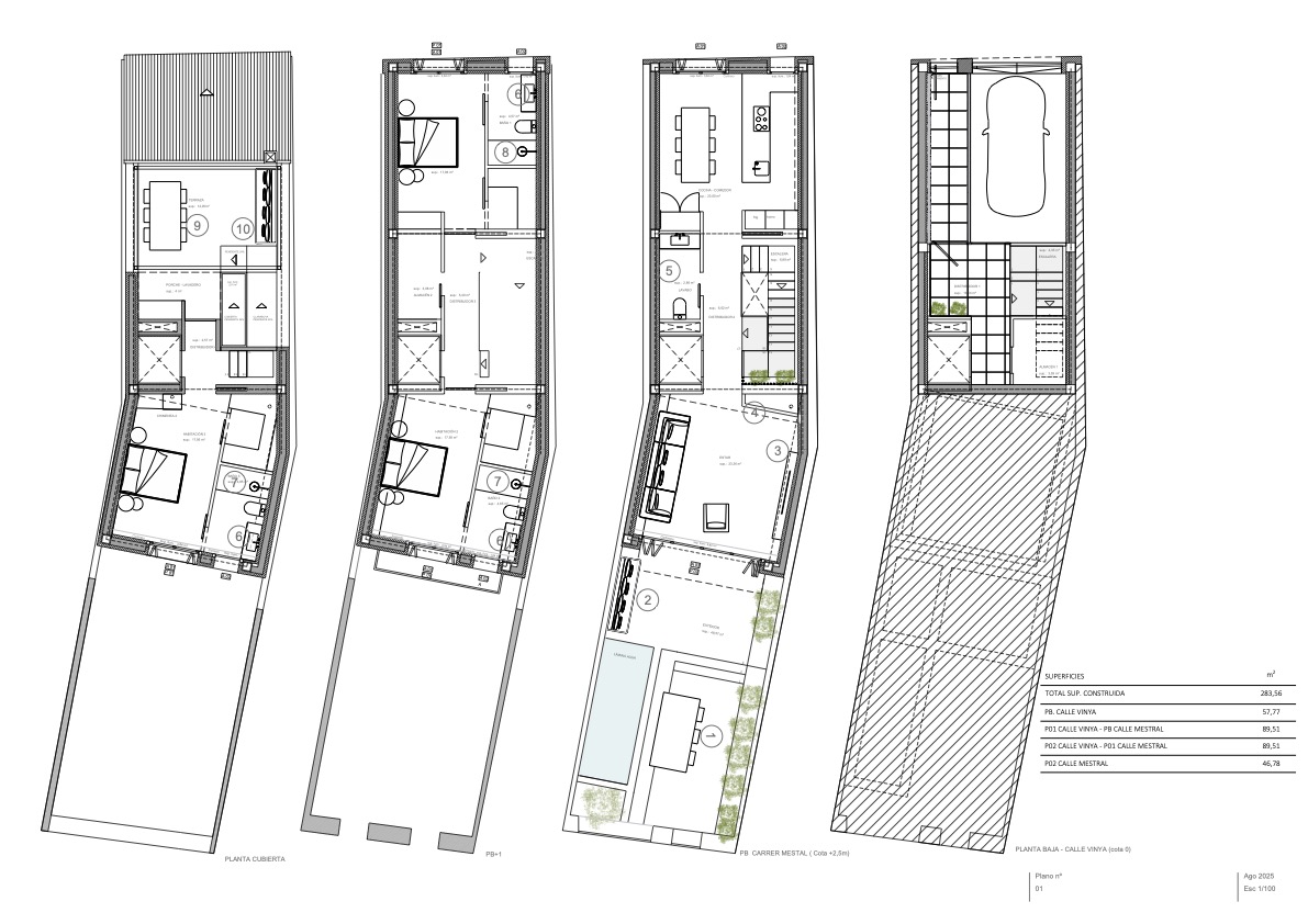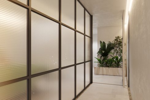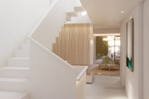 Ein einladender Innenhof offenbart einen gemütlichen Pool mit Terrasse, der einen Ort der Ruhe und Entspannung bietet. Das Erdgeschoss ist für das Wohnen und Unterhalten konzipiert und verfügt über ein geräumiges Wohnzimmer, das in eine offene Küche und einen Essbereich übergeht. Eine Gästetoilette vervollständigt diese Etage.