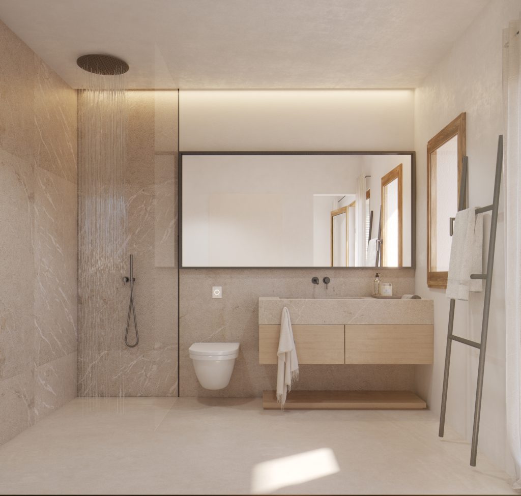 Die erste Etage ist ganz auf Komfort und Privatsphäre ausgerichtet und beherbergt zwei großzügige Schlafzimmer mit eigenem eleganten Bad und einem geräumigen begehbaren Kleiderschrank, der reichlich Stauraum und einen Hauch von Luxus bietet.