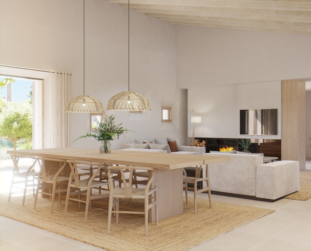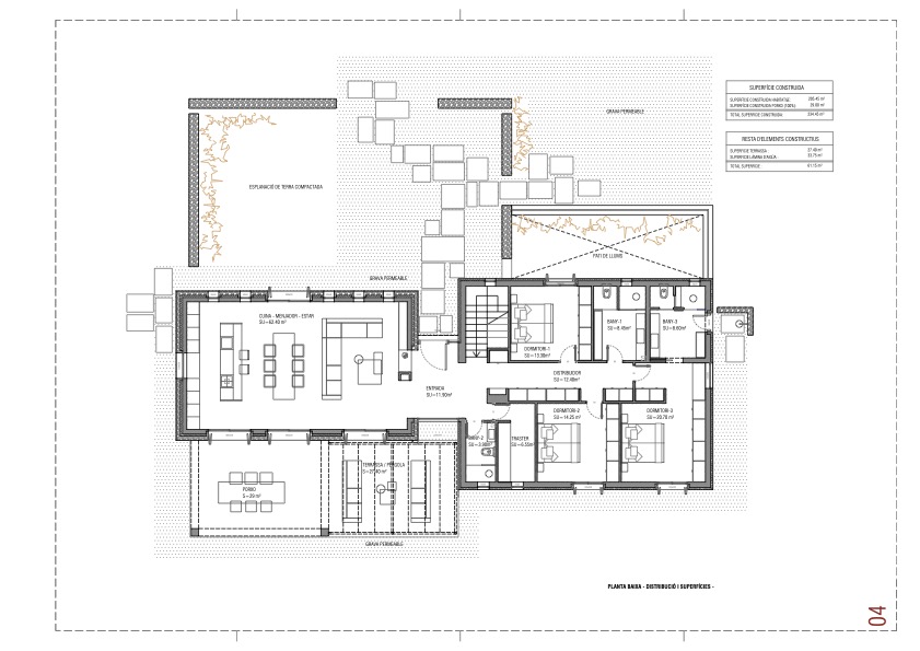Het doordachte project met een bebouwde oppervlakte van 234 m² heeft een ruime open indeling, waarbij de eet- en woonkamer naadloos aansluiten op de moderne keuken. In de gezellige woonkamer kunt u met uw dierbaren samenkomen bij de warmte van een knapperend haardvuur. De plannen omvatten drie royale slaapkamers en twee complete badkamers, die voldoende ruimte bieden voor familie en gasten, plus een handig gastentoilet. Een speciale berging zorgt ervoor dat alles zijn plaats heeft.