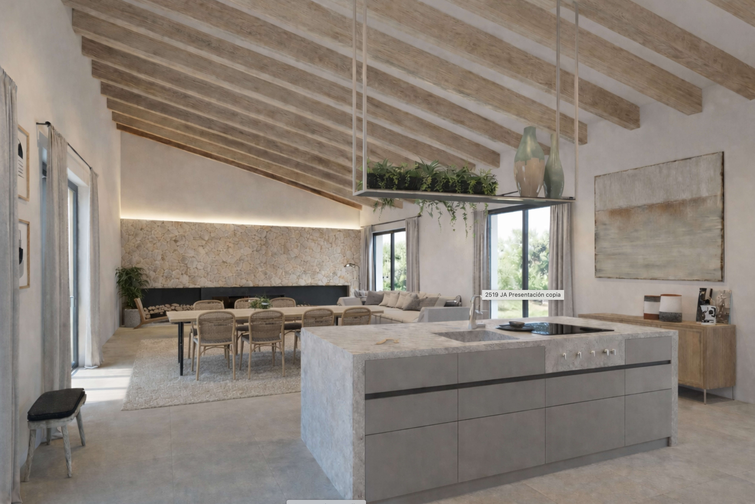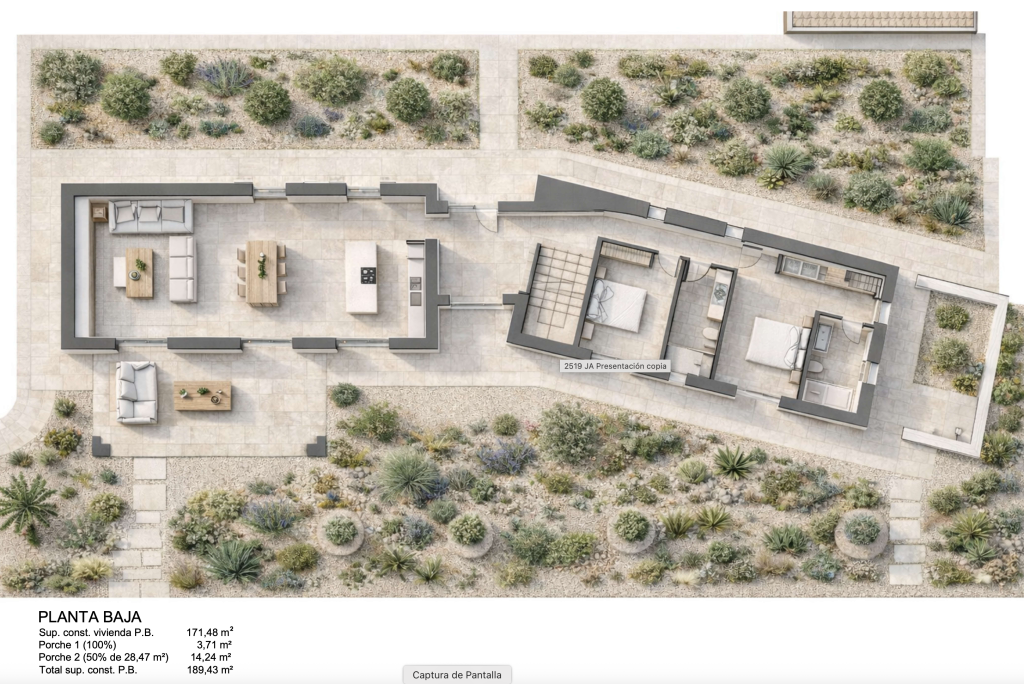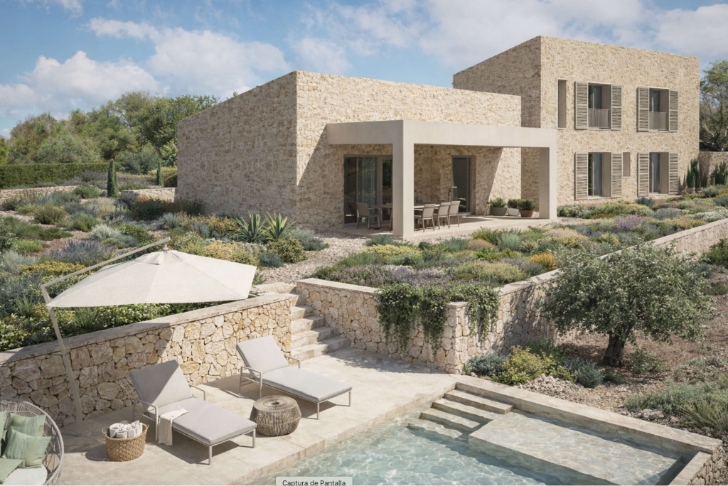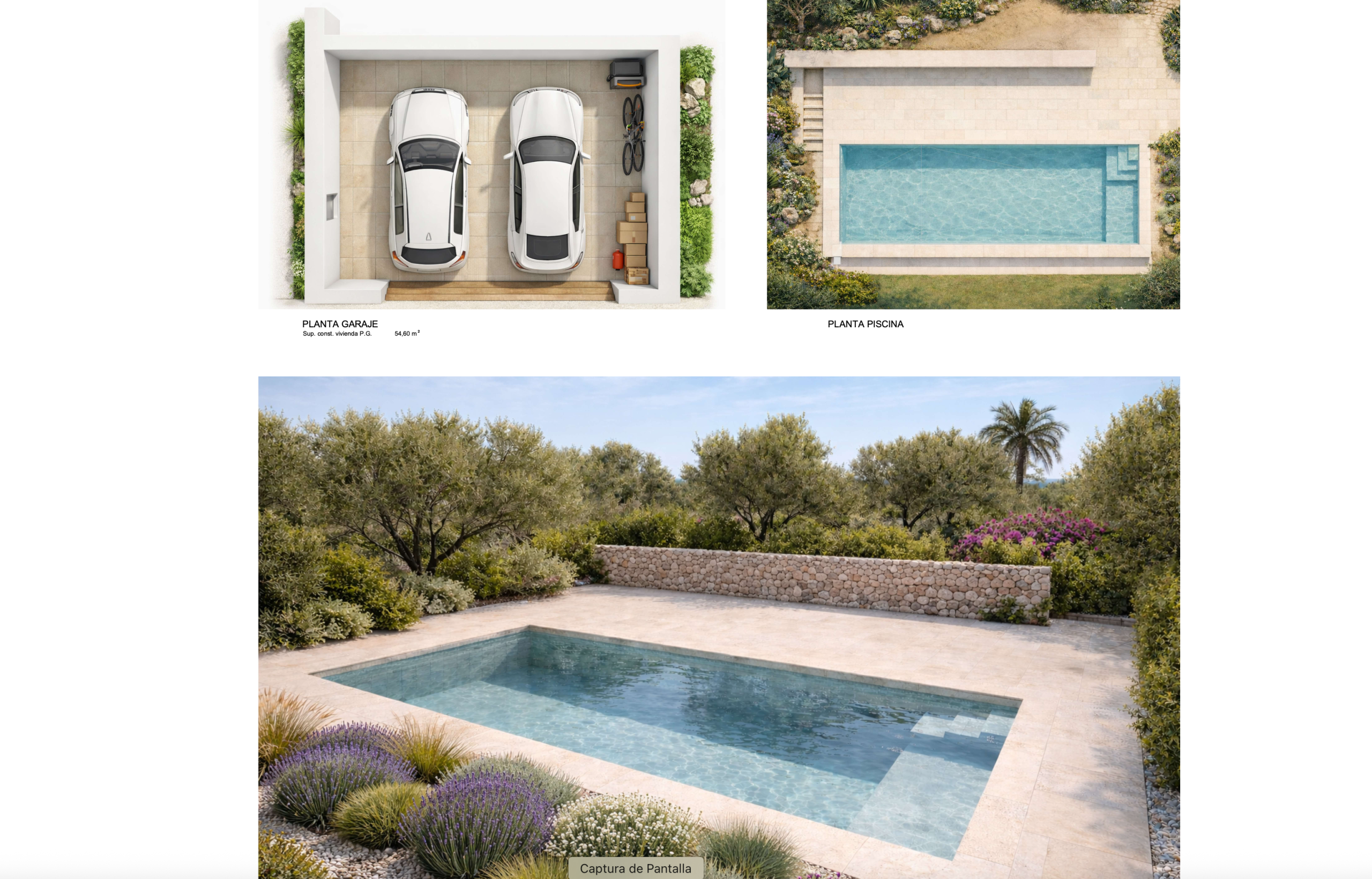 El proyecto contempla además varias terrazas, una piscina de 35 m², perfecta para disfrutar del clima mediterráneo, y un garaje de 54 m². El sótano, de 78 m², contiene una lavandería y un amplio espacio de almacenaje.